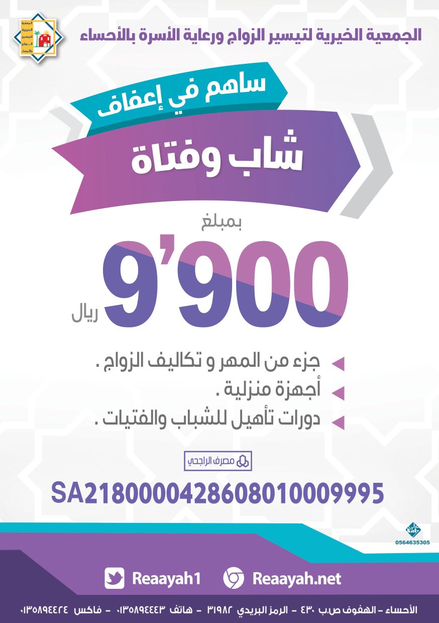جمعية تيسير الزواج رعاية On Twitter ساهم معنا في إعفاف شاب وفتاة هدفنا تزويج ٥٠٠ شاب خلال هذا العام ٢٠١٨ م رمضان الاحساء رعاية